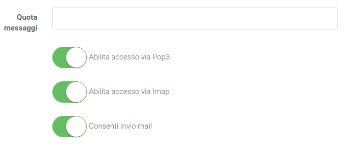 L'opzione "Consenti invio mail" ti permette di controllare, per ogni singola casella di posta, se accendere o bloccare l'invio di email. Di default l'impostazione è accesa. Questa funzionalità può risultare utile in diverse situazioni, come ad esempio bloccare una casella di posta del sito web che magari sta spedendo SPAM per lo sfruttamento di qualche falla.